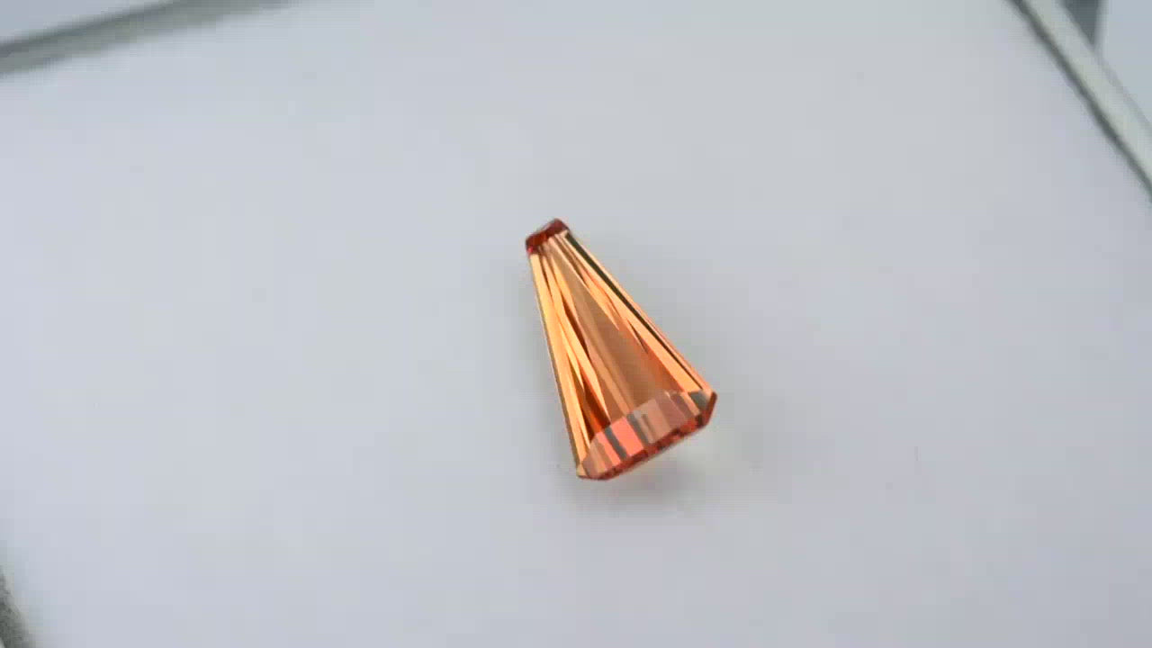 Custom tapered-cut orangey pink Padparadscha sapphire.